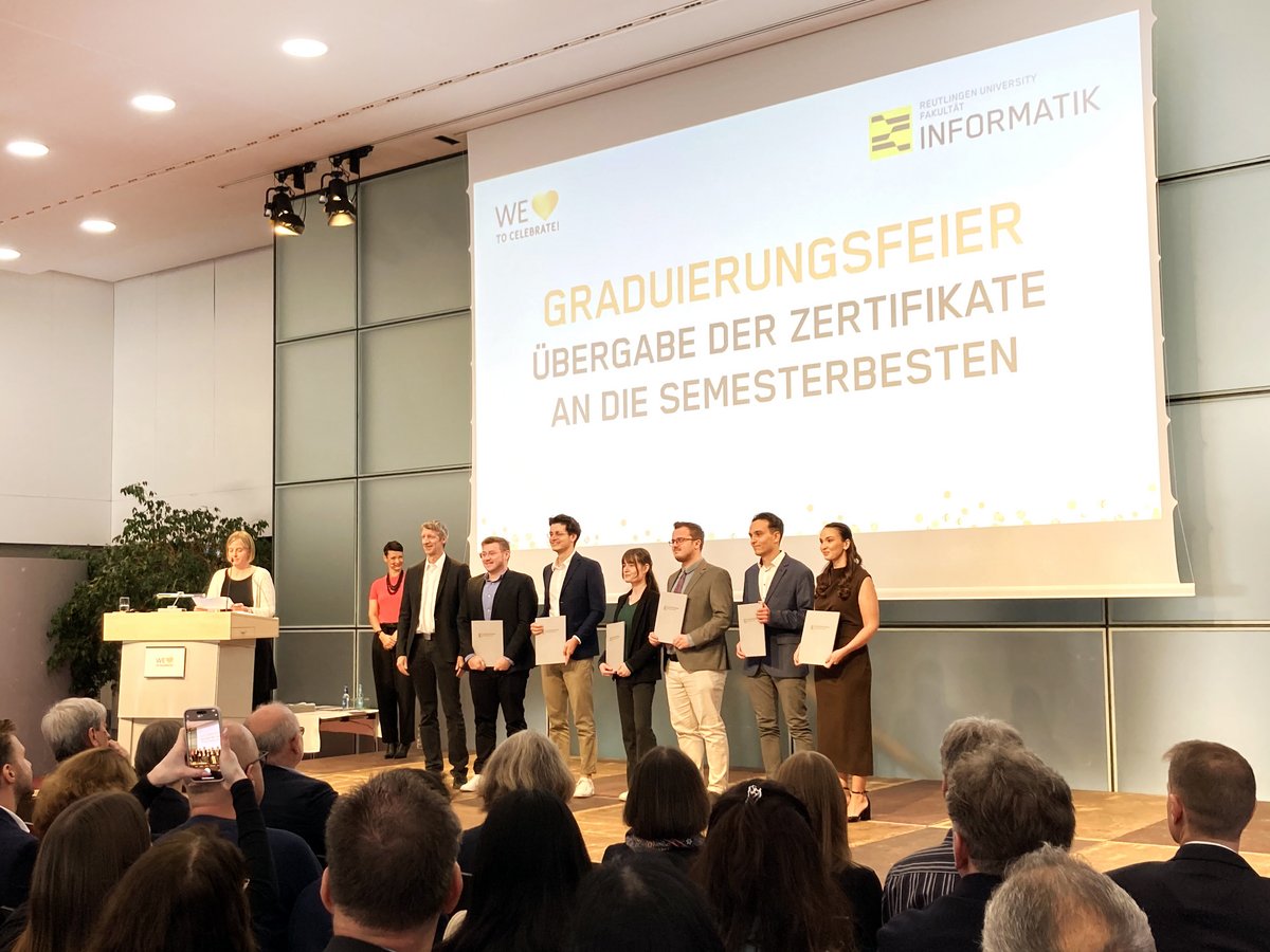 Bereits am Vormittag wurden während der zentralen Graduierungsfeier der Hochschule Reutlingen die besten Absolventinnen und Absolventen der jeweiligen Studiengänge geehrt. Irem Belik (Masterabsolventin des Studiengangs Human-Centered Computing) erhielt dabei den Otto-Johannsen-Preis, der jeweils für die beste Bachelor- und Masterarbeit der Hochschule vergeben wird.