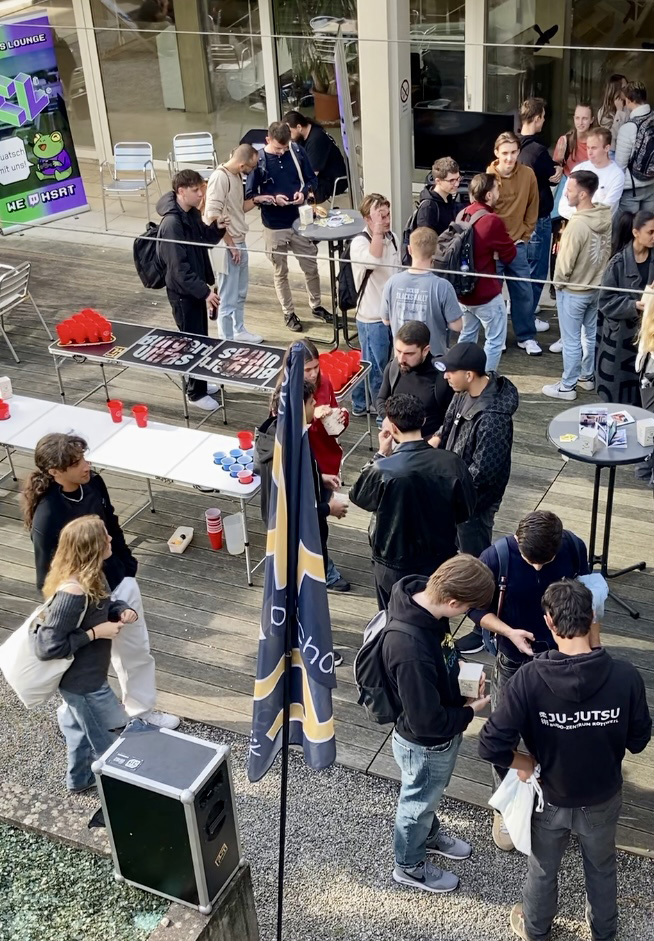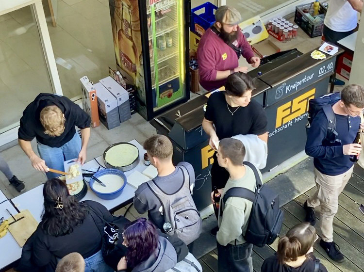 Im Anschluss an die Einführungsveranstaltungen der jeweiligen Studiengänge sorgte die Fachschaft Informatik für einen adäquaten Ausklang des Tages: Mit Popcorn, Crêpes und Hot Dogs, Musik und einer Runde Bier- (bzw. Spezi-) Pong im Innenhof, konnten die Erstsemester direkt in entspannter Atmosphäre ihre Kommilitoninnen und Kommilitonen kennenlernen und erste Kontakte zu höheren Semestern und Professor:innen knüpfen.