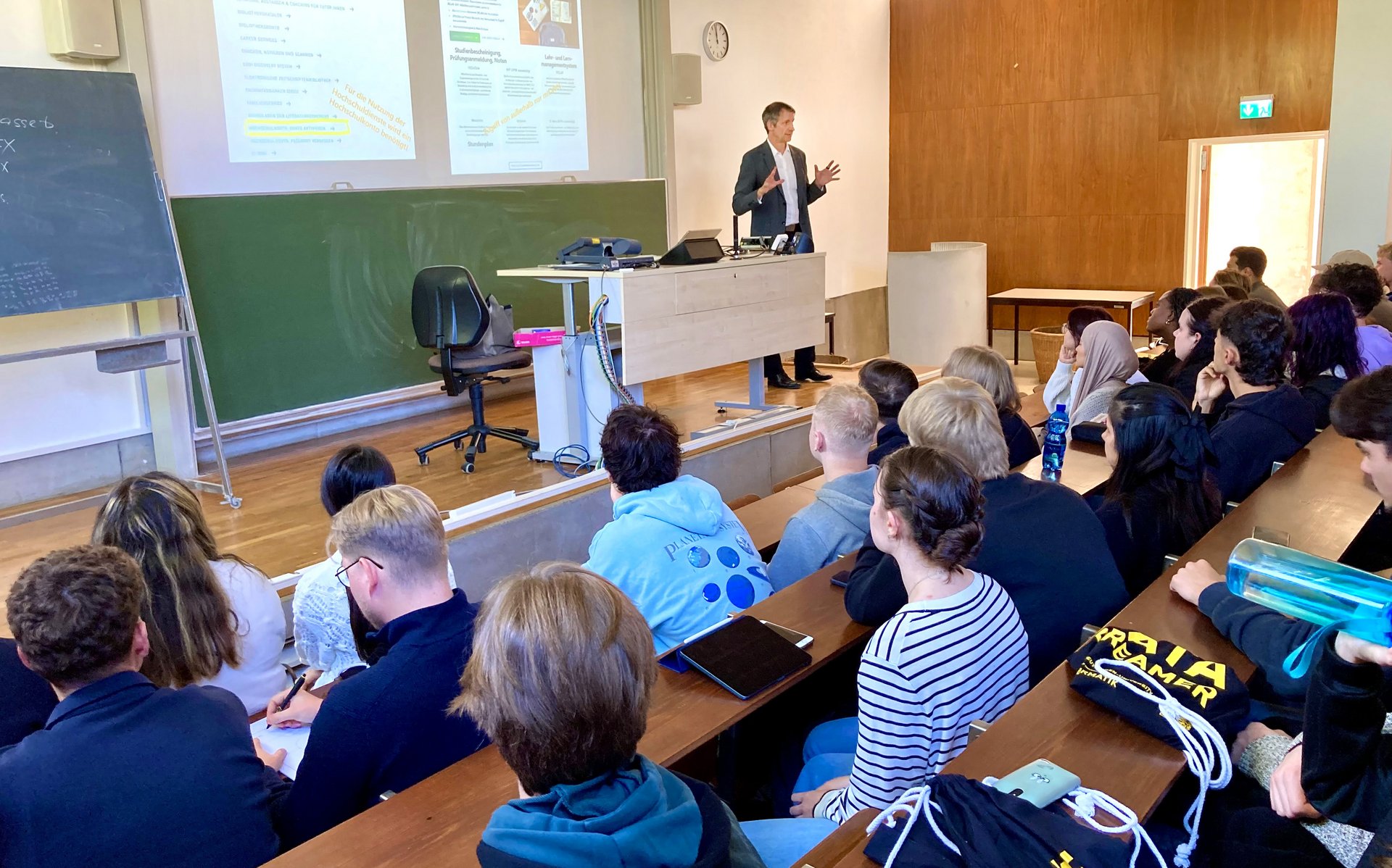 „Das ist ein wichtiger Punkt“, hakte Prof. Burgert an dieser Stelle ein, „Sie sind hier nicht alleine. Sollten Sie an irgendeiner Stelle Ihres Studiums einmal Probleme haben, sei es im Studium selbst, aber auch bei der Finanzierung oder bei anderen Themen – kommen Sie möglichst rechtzeitig auf uns zu, dann finden wir eine Lösung.“