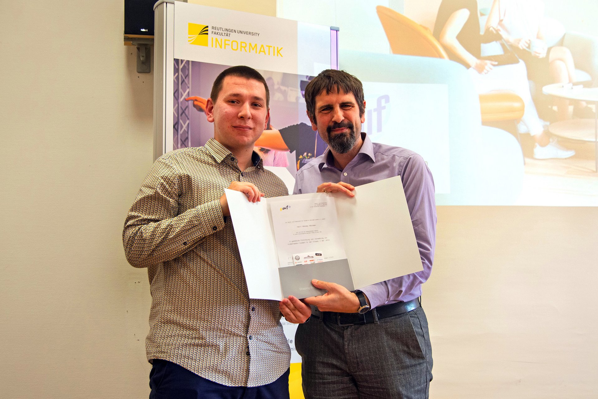 Einmal jährlich verleiht der Alumni-Verein der Fakultät Informatik, AUFnet e.V., den AUF- Preis für herausragende Abschlussarbeiten. In diesem Jahr ging die Auszeichnung an Peter Hristov für seine Thesis im Bereich Wirtschaft und Nachhaltigkeit. Der Absolvent der Wirtschaftsinformatik entwickelte eine datengetriebene Methode, die den Kerosinverbrauch reduzieren kann. Nikolay Nikolaev (Absolvent der Medien- und Kommunikationsinformatik) erhielt den Preis für die Entwicklung eines KI-gestützten Systems, das Kubernetes-Cluster automatisch einrichtet und verwaltet, um im Lehrbetrieb zuverlässige und fehlerfreie Rechenumgebungen für Dozenten und Studierende bereitzustellen.