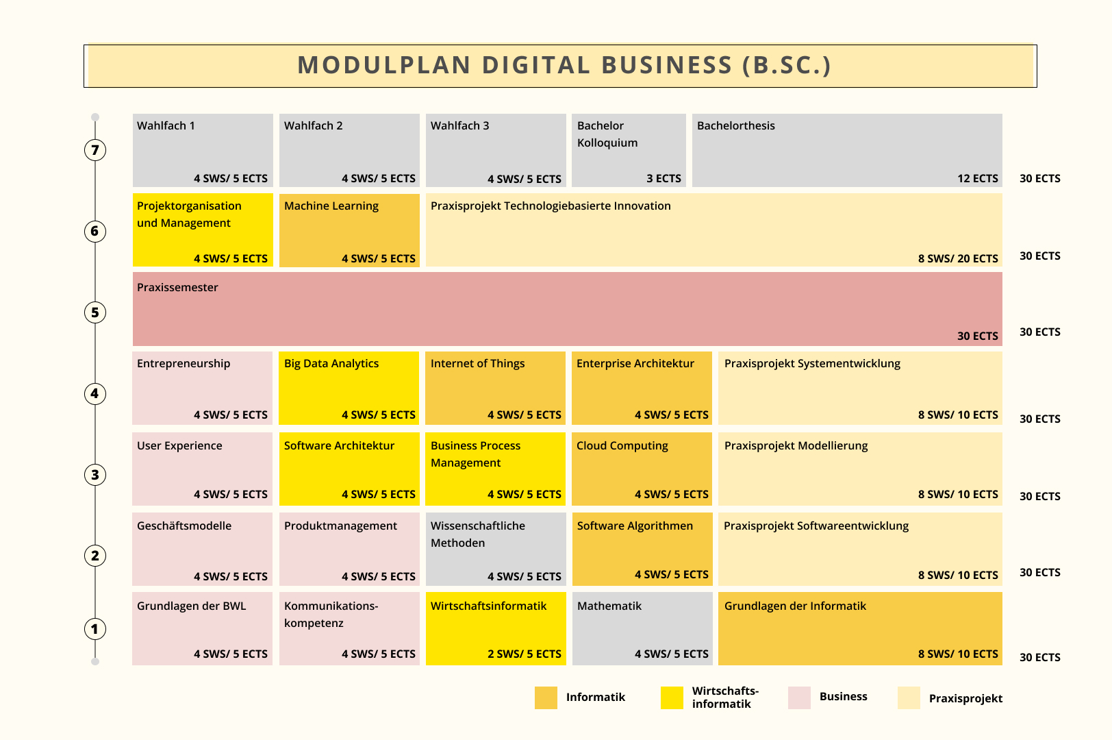 Neben Deiner Themenwahl in den Praxisprojekten kannst Du in drei Wahlfachmodulen im siebten Semester Deine persönlichen Interessen weiterverfolgen, bisher unbekannte Themen aus dem Bereich Digital Business kennenlernen oder Dein Wissen um Inhalte angrenzender Disziplinen erweitern. Dadurch kannst Du Dein Studium Deinen persönlichen und beruflichen Zielen anpassen und individuelle Schwerpunkte setzen. Mögliche Wahlmodule sind beispielsweise IT Security, Web Application Development, Online Marketing oder Business Consulting.